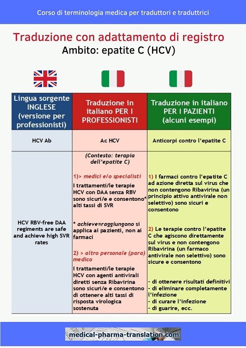 Il primo testo è estratto dalla revisione di una traduzione medica tedesco-italiano che ho io stessa eseguito (colonna di destra). Il secondo esempio mostra una traduzione inglese-italiano con adattamento di registro al linguaggio settoriale del pubblico di destinazione.